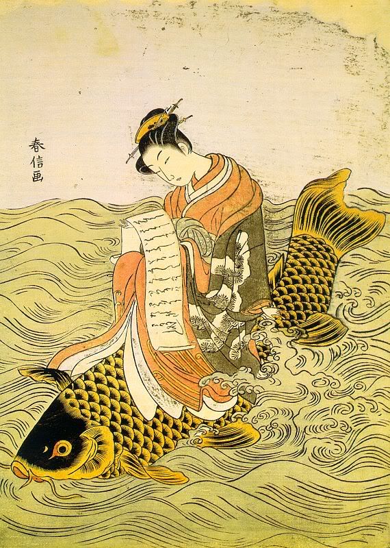 i just finished my asian art class! i turned in my final online, but i guess i still have to go to class tonight. either way, here's a lovely image of a prostitute riding a fish! by the great japanese printmaker, harunobu.